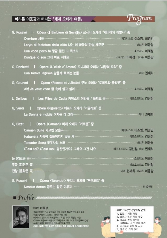 이날 공연은 김천에서 나고 자라 월드스타로 자리매김한 바리톤 이응광과 유럽의 스타 음악가들이 함께 오페라 아리아 무대를 선사한다. 바리톤에 이응광, 메조소프라노에 김선정, 소프라노에 이혜정, 테너 권재희가 출연하며 피아니스트 이소영, 최영민의 연주와 무용수 이유영의 춤이 더해져 오페라 갈라 콘서트 형식의 완성도 있는 무대를 연출한다.바리톤 이응광은 독일 알렉산더 지라르디 국제 콩쿠르 1위, 리카르도 잔도나이 국제콩쿠르 1위, 스위스 에른스트 해플리거 국제콩쿠르 1위 등 유수의 국제콩쿠르에서 수상하며 실력을 입증했고 2008년부터 2015년까지 스위스 바젤 오페라극장 전속 주역가수로 인정받으며 스위스의 바젤 신문에서는 “그의 소리를 한번 들으면 그것에서 쉽게 헤어 나올 수 없다.”라는 찬사를 보낼 만큼 현재 유럽에서 가장 사랑받고 있는 성악가로 활동 하고 있다.이번 공연은 오페라 세비야의 이발사, 사랑의 묘약, 로미오와 줄리엣 등 대중들에게 친숙한 곡들로 프로그램을 구성하여 오페라를 쉽게 이해할 수 있도록 했고 유럽에서 활동 중인 스타 음악가들의 아름다운 아리아로 시민들에게 겨울밤의 낭만적인 감동을 선사할 예정이다. 문화예술회관에서는 공연 감상을 위해 방문한 관람객들이 안심하고 관람할 수 있도록 상영관 소독, 손소독제 비치 등 방역 활동에 총력을 기울이고 있다.공연 시간은 약 90분 정도이며, 관람 가능 연령은 초등학생이상이다. 공연 관람료는 전석 1만원이며 유료회원은 30% 할인된 가격에 구매할 수 있다. 관람권은 11월 25일(목) 오후 2시부터 문화예술회관 홈페이지(www.gc.go.kr/gcart/) 등을 통해 예매할 수 있다.문의) ☎ 054-420-7824, 홈페이지 https://www.gc.go.kr/gcart/