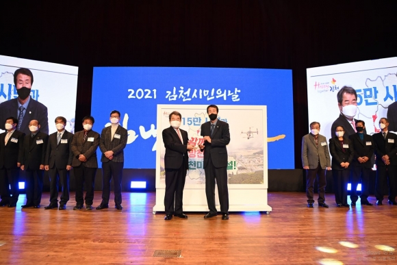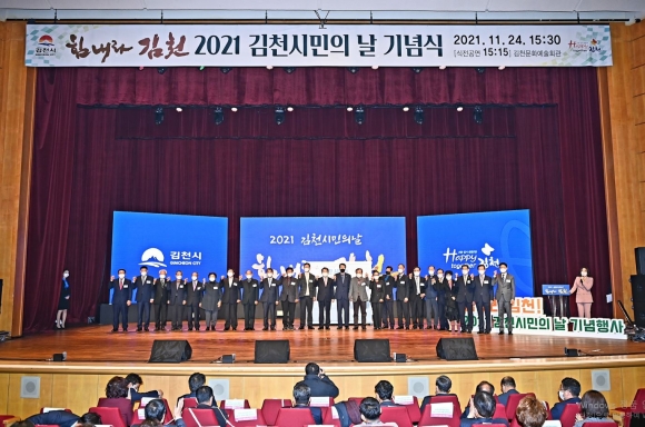 김천시(시장 김충섭)에서는 2021년도 김천시민의 날 기념행사를 방역수칙을 준수한 가운데 지난 11월 24일 개최했다.이날 행사는 시립국악단의 신명 나는 공연을 시작으로 시민헌장 낭독, 자랑스러운 시민상 시상, 기념 퍼포먼스, 시민의 노래 제창 순으로 진행되었다.2년간 코로나와 힘든 사투를 벌인 의료진 2명이 시민헌장을 낭독했으며, 특히 시민상 수상자와 함께한 퍼즐 조합 퍼포먼스는 여러 개의 조각이 모여 하나의 완성품이 되듯, 시민 한명 한명이 김천의 주인임을 상기하며 시민화합과 앞으로 다가올 희망찬 김천 미래 발전을 기원했다.