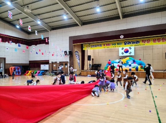 김천유치원(원장 장옥남)은 12월10일(금)에 전체 유아들과 교직원이 함께 참여해 만들어 가는‘우리끼리 작은 운동회’를 열었다. 운동회는 홍팀, 백팀 대표가 나와 선서를 하며 시작되었다. 신나는 몸 풀기 체조를 하며 안전하고 즐거운 운동회가 진행되었다. 운동회는 1부와 2부로 나누어 1부 명랑운동회는 코끼리 코 넘기, 달리기 시합, 에어 도넛 릴레이, 에어 사다리 릴레이, 볼풀공 던져 넘기기, 5공구 장애물 달리기 등 다양한 놀이 중심의 체육활동으로 이루어졌다.