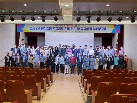 경상북도김천교육지원청(교육장 박삼봉)은 2022. 6. 3.(금) 오후 1시 30분 부터 학생문화예술센터 드림마루에서 행정실장을 대상으로 고위직 맞춤형 폭력예방교육 및 주요업무 전달회의를 실시하였다. 이날 회의는 교육지원청과 학교 현장의 원활한 업무추진을 위하여 교육지원청 각 담당별 주요업무 전달을 시작으로 학교 현장의 고충 및 현안사항에 대하여 소통하는 시간을 가졌다. 이어 위드교육센터 대표 이은희 강사를 초청해 행정실장 맞춤형 성희롱·성폭력예방교육을 실시하여 중간관리자로서의 올바른 성인지 감수성을 높일 수 있는 계기를 마련하였다.박삼봉교육장은 “권위라고 하는 것은 구체적인 사안에 있어서 효용성과 목표달성에 가장 중요한 것으로, 행정실장님들께서 굳건히 그 자리에서 권위를 세울 수 있는 방법은 다른 무엇보다 일을 잘하는 것”이라 하면서 “학교 현장에서 우리 김천 교육을 위해 적극적으로 업무에 임해줄 것”을 당부하였다. |