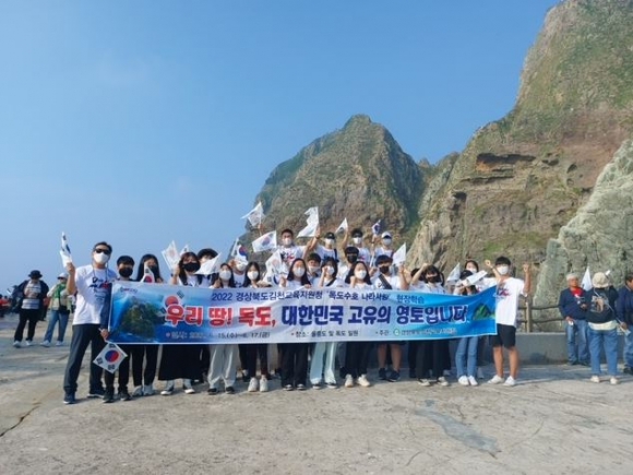 경상북도김천교육지원청(교육장 박삼봉)은 6월 15일(수) ∼ 6월 17일(금)까지 2박 3일간 관내 중학교 학생 30명 및 독도동아리 담당교사 2명, 교육지원청 관계자 3명 등 총 35명을 대상으로 2022년 `독도수호 나라사랑` 독도체험 현장학습을 실시하였다. 이번 행사는 학생들의 실질적인 체험학습 통한 대한민국 고유 영토인 독도에 대한 올바른 인식 제고와 독도 수호 의지 강화 및 애국심 고취라는 목적으로 진행되었다. 그 결과 학생들은 독도 이해교육 및 독도현장 탐방, 독도의용수비대 방문, 독도박물관 견학 등으로 독도 지형을 정확히 알고, 독도 역사와 의미를 되새겨 보는 시간의 계기를 마련하였으며, 해양 프로그램인 유람선 해상일주 통해 울릉도의 절경을 느끼며 현장체험의 의미를 되새겨보는 시간을 가질 수 있었다.