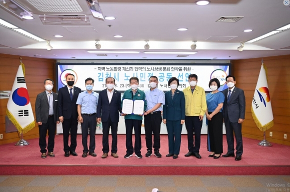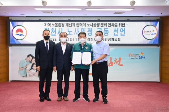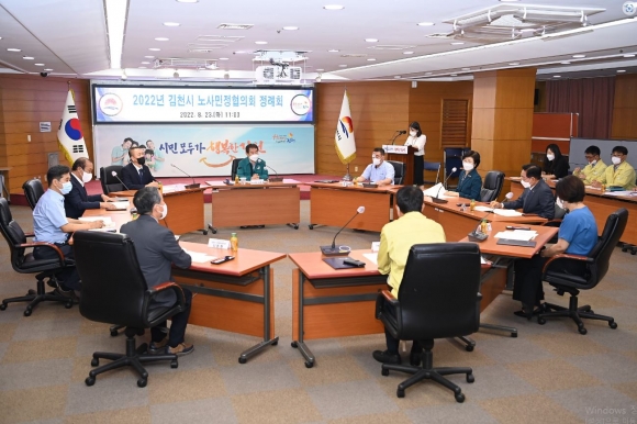 김천시 노사민정협의회(위원장 김충섭 김천시장)는 23일(화) 시청 2층 회의실에서 2022년 정례회를 개최하고, 「지역 노동환경 개선과 협력의 노사상생 문화 안착을 위한 공동선언문」을 채택했다.