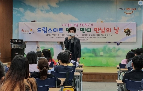 김천시(시장 김충섭) 드림스타트에서는 지난 9월 1일 드림스타트 아동과 자원봉사자 55명이 함께하는 멘토 - 멘티 만남의 날 행사는 김경희 복지환경국장님의 인사말을 시작으로 진행되었다.