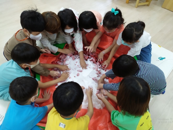 먼저 유아들은 가을에 볼 수 있는 열매 중 오미자에 대해 자세히 알아보며 오미자의 ‘다섯 가지 맛’이 어떤 맛일지 이야기를 나누었다. 열매반 박○○ 유아는 “오미자의 달콤한 맛은 바나나처럼 달콤할 것 같아요.”라고 말하며 오미자의 맛을 상상해 표현하기도 하였다. 유아들은 직접 오미자를 관찰하고 만져보면서 오미자의 모양과 색깔, 촉감을 느껴본 후 오미자청을 담그는 방법과 100일이라는 시간을 기다려야 먹을 수 있다는 설명을 들으며 오미자청 담그기를 하였다.