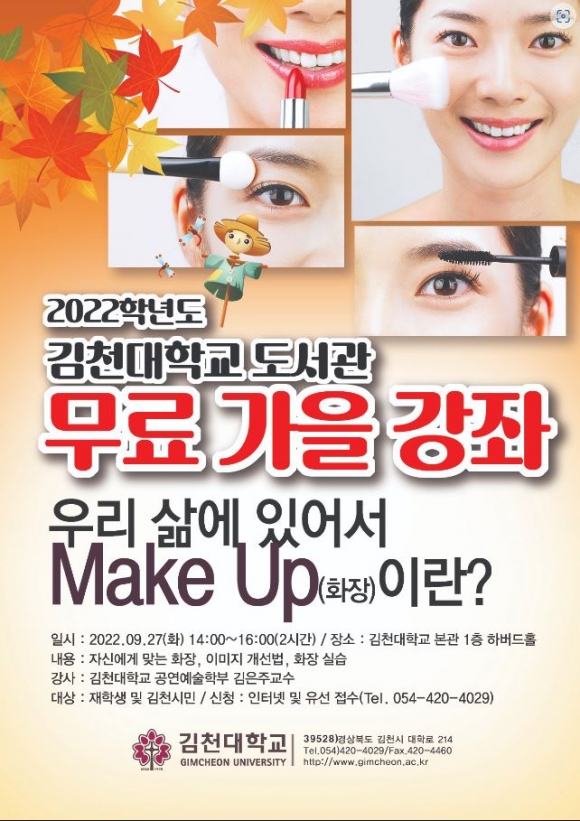 김천대학교(총장 윤옥현) 도서관(관장 이수원)에서는 9월 23일까지 김천시민 대상과 김천대 재학생들(60명)의 인문역량강화 사업의 일환으로 도서관 무료 가을 강좌를 시행한다고 20일 밝혔다.김천대 이수원 도서관장은 “도서관 강좌는 지역시민과 김천대학교 재학생의 소양 함양과 역량 강화를 위한 프로그램으로 김천대학교의 교육목표인 인간중심인재 양성에 이바지 하고자 한다.”고 하였다.도서관 강좌는 김천대학교 본관 1층 하버드홀에서 진행되며, 이번 회차에서는 김천대학교 공연예술학부 김은주교수를 초청하여 “우리 삶에 있어서 화장(make up)이란?”이라는 주제로 화장(make up)에 대한 올바른 이해와 이미지 개선 방법과 화장(make up) 실습까지 진행 할 예정이다.대학관계자는 “김천대학교 도서관에서는 이번 강좌를 기점으로 수강생들의 지가 관리와 이미지 개선을 통한 자심감 향상으로 이어지길 기대하며, 참여 학생들이 보다 즐거운 대학생활과 김천대학교의 인재상인 진취적인 세계인으로 거듭나기를 바란다.”고 하였다.또한, 도서관 가을 강좌는 지역사회의 교양 저변 확대를 위해 관심 있는 지역민들 역시 참여 가능하며, 접수는 유선으로 진행 할 예정이며, 11월경 “이불속 Book 콘서트”라는 이름으로 무료 강좌가 더 예정되어 있다.