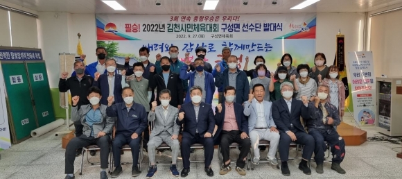 구성면 체육회(회장 오세진)는 27일 구성면행정복지센터 2층 회의실에서 필승을 다짐하는 2022년 김천시민체육대회 구성면 선수단 발대식을 개최했다.