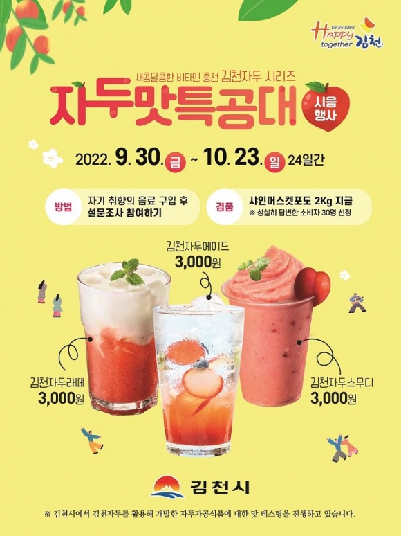 김천시는 9월 30일 ~ 10월 23일까지 김천자두로 만든 가공제품을 활용한 시음행사인 「자두맛 특공대」를 추진한다.