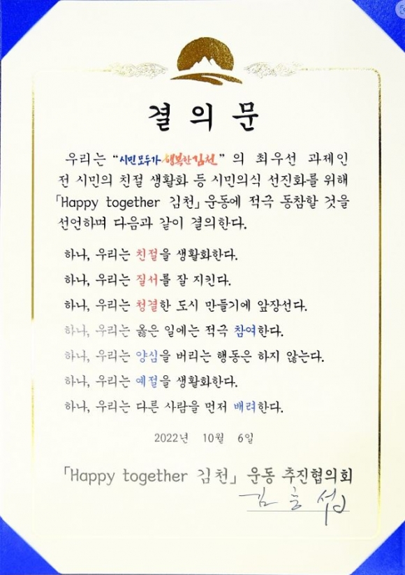 이날 위촉식에는 김충섭 김천시장, 윤옥현 김천대학교 총장, 박삼봉 김천교육지원청 교육장, 안용우 김천상공회의소 회장, 박대하 김천시의회 의원 등 각 분야를 대표하는 기관·단체장 35명이 참석, 「Happy together 김천」운동 실천에 앞장설 추진협의회 고문 및 위원으로 위촉됐다.