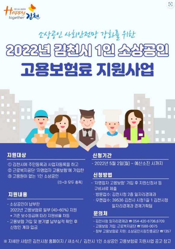 ▶1인 소상공인 고용보험료 지원 2022년 5월부터는 1인 소상공인을 대상으로 고용보험 가입을 활성화하고, 사회안전망 사각지대 해소를 위해 고용보험료를 지원하고 있다. 주민등록과 사업장 모두를 관내에 두고 있는 자영업자 고용보험에 가입한 1인 소상공인을 대상으로 고용보험료의 40~60%를 지원하고, 소상공인진흥공단 보험료 지원과도 중복신청이 가능하여 추가 혜택을 받을 수 있다.
