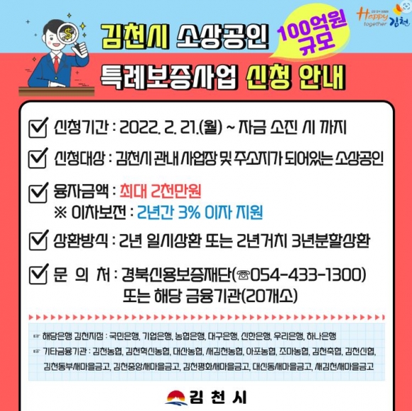 ◎ 소상공인 지원을 통한 골목경제 회복 노력 ▶100억원 규모 특례보증사업 시행 : 경북 최대 규모 경제난으로 어려움을 겪고 있는 지역 소상공인들을 대상으로 경북신용보증재단의 100% 보증으로 최대 2천만원까지 융자를 지원하고, 2년간 이자 3%를 보전하는 내용으로 특례보증사업을 추진하고 있다.해당 사업은 2018년부터 올해까지 5년간 시 예산 80억원을 출연하여 경북 23개 시군 중 최대인 800억원 규모로 총 3,201명에게 융자를 지원해 소상공인의 경제적 부담 완화에 적극 기여하고 있다.