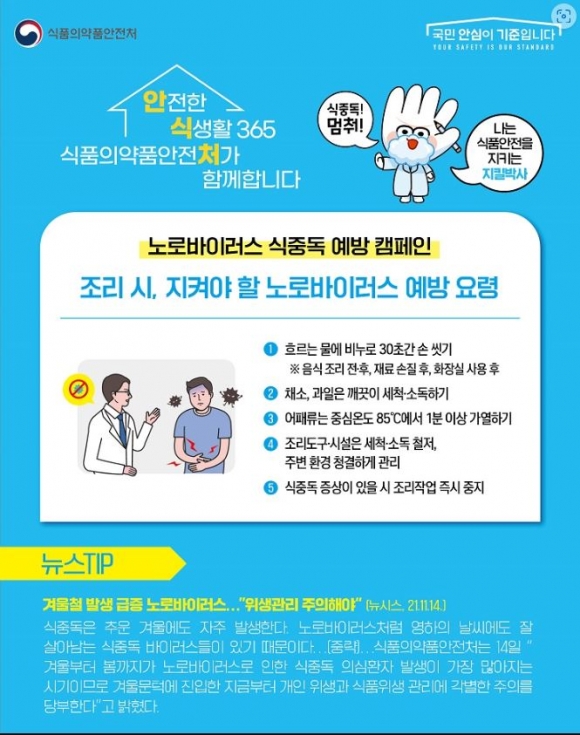 이성화 환경위생과장은 “식중독은 계절에 상관없이 항상 주의해야 한다”며 “노로바이러스 식중독 예방을 위하여 예방 수칙을 생활화 해 달라”고 당부했다.