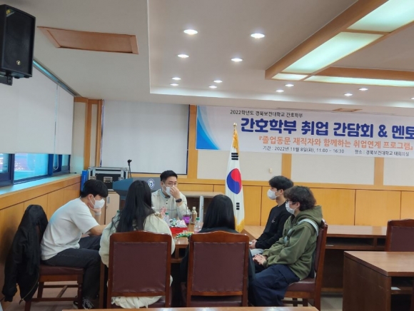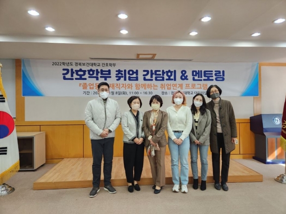경북보건대학교(총장 이은직)가 지난 11월 8일 본교 대학본부 대회의실에서‘협력 기관 졸업생 재직자와 본교 재학생 네트워크 구축 및 관계 형성의 목적으로 산학 공동 취업 연계 프로그램을 진행하였다. 이번 프로그램에는 현재 백병원에 근무하는 이승희, 이다혜, 양지연 간호사가 동문 재직자로 참가하여 후배들에게 간담회를 하며 병원 현장의 생생한 경험과 노하우전수 및 병원 취업을 위한 멘토링 프로그램을 진행하였다.