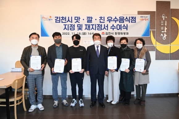 김천시(시장 김충섭)는 11. 18.(금) 율곡동 우리반상시월에서 김천의 맛과 멋을 담고 있으면서 “Happy together 김천” 운동을 모범적으로 실천하는 ‘김천시 맛·깔·친(맛있고 깔끔하고 친절한 업소) 우수음식점’ 신규 지정 2개소와 재지정 4개소를 선정하여 지정서를 수여했다.