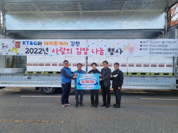 「사랑의 김장나누기」는 KT&G 김천공장에서 후원하고 김천시 지역사회보장협의체와 김천시장애인복지관이 함께 주관하여, 관내 27개 사회복지기관·단체·시설과 17개 읍면동 지역사회보장협의체에서 참여했다. 전달된 김치는 참여기관을 통해 독거노인, 장애인 등 소외계층 763세대에 전달될 예정이다.