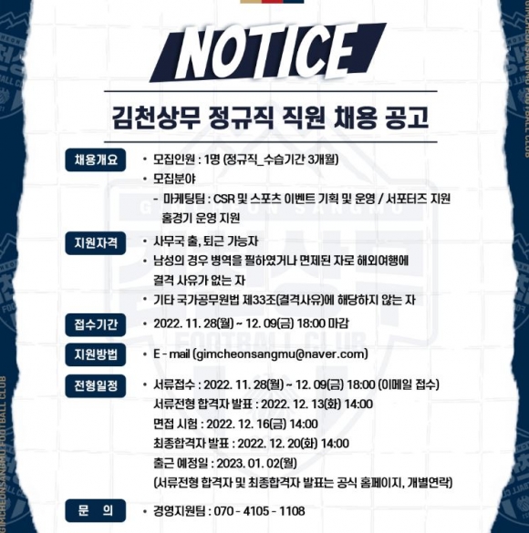 김천상무프로축구단이 28일부터 내달 9일까지 정규직 직원 채용을 실시한다. 채용 분야는 마케팅팀 사원 1명이며 CSR 및 이벤트 기획, 운영 업무를 담당한다. 또한 서포터즈, 홈경기 운영 지원 등 다양한 업무를 지원하게 된다.