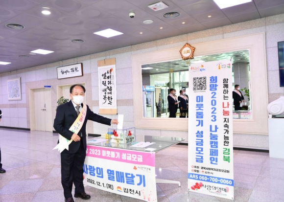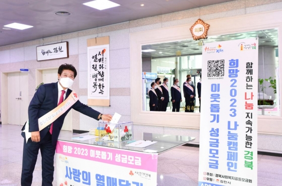 김천시의회(의장 이명기)는 12월 1일 오전 어려운 이웃에게 따뜻한 사랑의 마음을 전하기 위해 「희망2023 나눔 캠페인」에 참여하여 경북사회복지공동모금회에 성금을 전달하였다.