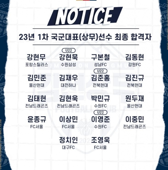 병무청은 1일 오전 10시, ‘23년 1차 국군대표(상무) 운동선수(병)’ 남자축구 부문 최종합격자를 발표했다. 91명의 서류 합격자 중 18명이 최종합격하며 역대급 경쟁률을 보였다. 최종합격자 명단에는 국가대표 윤종규, 박민규, 조영욱, 원두재, 김진규, 이상민 등 내로라하는 선수들이 포함됐다.