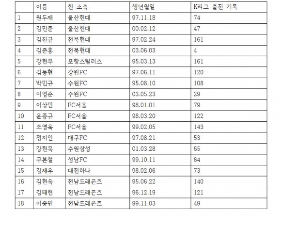 이밖에도 김민준(울산), 강현무(포항), 정치인(대구), 구본철(성남), 김현욱, 김태현, 이중민(이상 전남)도 합격자 명단에 포함됐다.