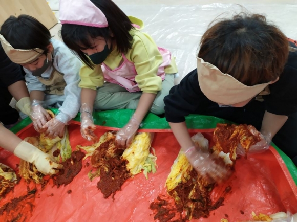 김치 양념을 배춧잎 사이사이에 끼워 넣으며 맛있는 김치가 완성되었으며 서○○ 유아는“저는 매운 김치도 잘 먹어요”라고 하였고, 김○○유아는“우리 가족이랑 김치볶음밥 만들어서 먹고싶어요”라며 이야기하였다. 체험 후 김장김치는 가정으로 가져가서 가족과 함께 먹어보는 가족 사랑을 실천할 수 있는 계기가 되었다.