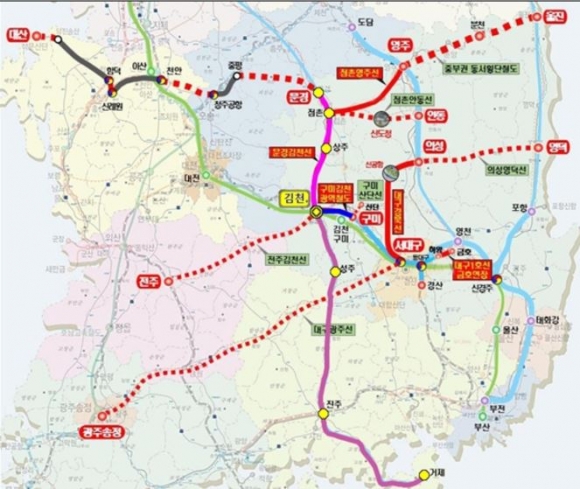 금년 상반기 국토교통부에서 사전타당성 조사용역을 착수 했으며, 김천시는 국토교통부와 철도통과 노선 지자체와 긴밀히 공조해 노선신설의 경제성 확보를 위해 최선의 노력을 기울일 방침이다.