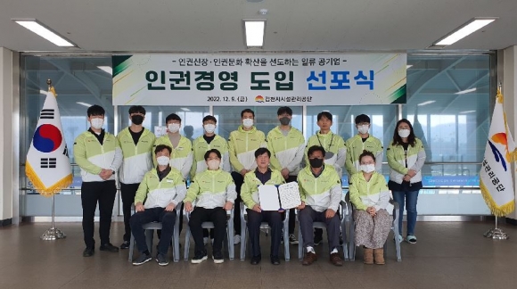 김천시 시설관리공단(이사장 김재광)은 지난 12월 9일 김천실내수영장에서 임직원이 참여한 가운데 인권경영 선포식을 개최했다. 이번 선포식은 인권존중과 인권침해 예방을 위한 이사장의 실천 의지를 대내외로 선언하기 위해 마련되었다.