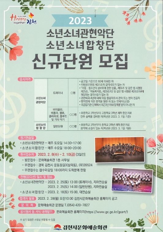 김천시문화예술회관(관장 배정화)에서 지역 문화예술 창달에 힘쓸 시립예술단 신규단원을 모집한다.