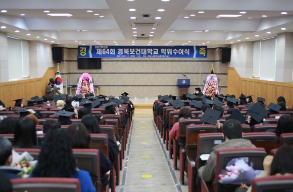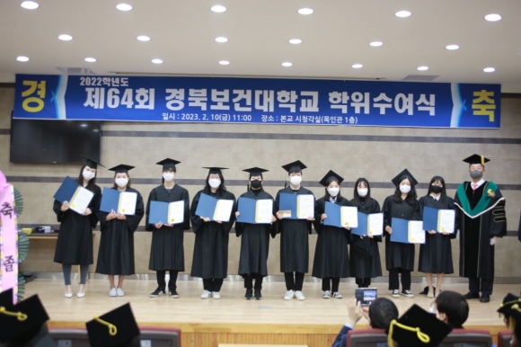 경북보건대학교(총장 이은직)는 지난 10일 교내 목인관 시청각실에서 이은직 총장 및 대학 관계자와 졸업생 수상자와 학부모들이 참석한 가운데 제64회 학위수여식을 개최했다.