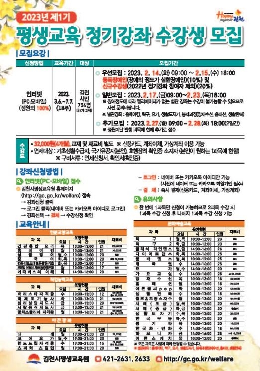 김천시평생교육원에서는 「2023년 평생교육 정기강좌」 수강생 37개 과목 754명을 2월 14일(화) 우선모집을 시작으로 2월 28일(화)까지 모집한다고 밝혔다.