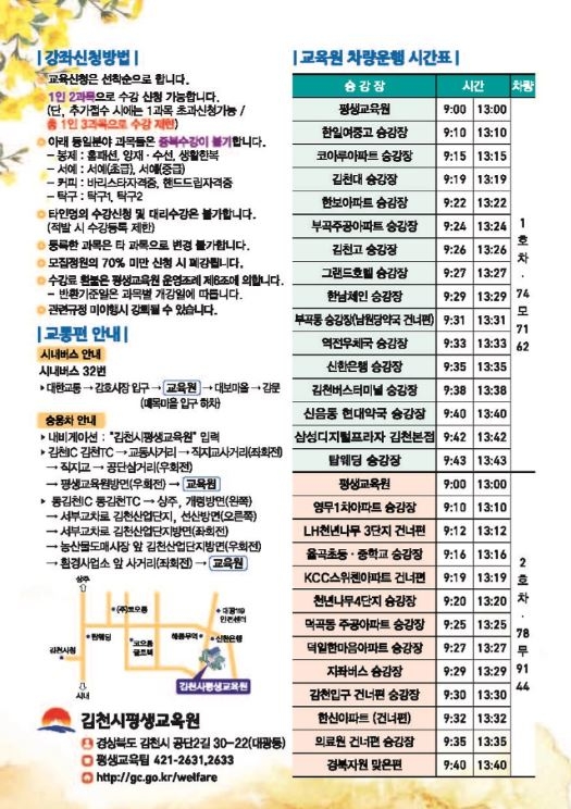 우선모집을 통해 장애인(10%) 및 신규수강생(20%)에게 수강 신청할 수 있는 우선권을 주어 시민들이 다양한 혜택을 받을 수 있도록 할 예정이며, 수강료는 4개월간 32,000원이고 김천시평생교육원 홈페이지(http://gc.go.kr/welfare)을 통해 수강 신청이 가능하다.