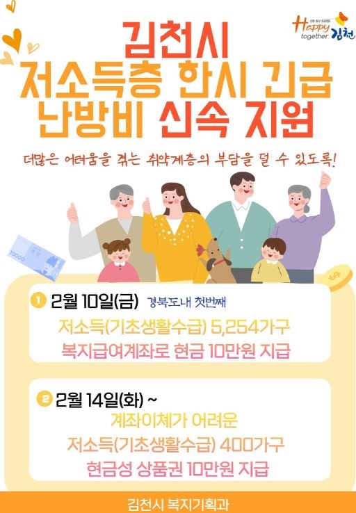 이번 한시 긴급 난방비 지원은 한파와 난방비 급등으로 위기상황에 노출되기 쉬운 저소득(기초생활수급권자) 가구의 부담을 덜기 위해서 지난 3일 6억 원의 예산을 긴급 편성한 사업이다. 별도 신청 없이 저소득주민(기초생활수급권자) 5,254가구에 복지 급여계좌로 현금 10만원을 지난 10일 신속하게 지원했고, 14일부터 각 읍면동행정복지센터를 통해 계좌이체가 불가능한 저소득주민 400가구에 현금성 지역상품권인 ‘김천사랑상품권’이 지급됐다.