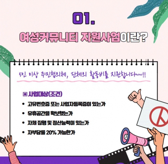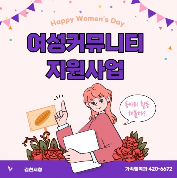 김천시(시장 김충섭)에서는 오는 2월 22일부터 3월 2일까지 「2023년도 여성커뮤니티 지원사업」을 공모한다. 여성커뮤니티 사업은 공공 및 민간의 유휴 공간을 이용하여 여성의 소모임, 동아리 활동, 돌봄, 취업․창업 등 사회적 관계 형성에 활용될 수 있도록 여성의 사회참여 활성화를 지원하는 사업이다.