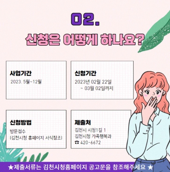 신청 자격은 5인 이상 주민협의체 또는 단체 중 자치규약을 갖추고 단체명의 고유번호증 또는 사업자등록증이 있어야 하며 보조금 집행 및 정산이 가능한 단체로 자세한 내용은 김천시 홈페이지에서 확인할 수 있다.