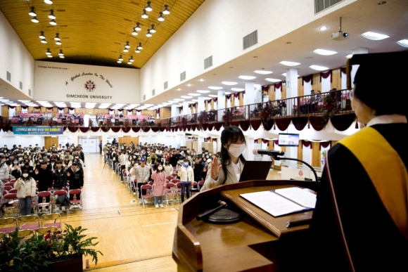 □ 김천대학교 제45회 입학식이 2월 28일(화) 오전 11시 생명관(대학 강당)에서 성대하게 열렸다.