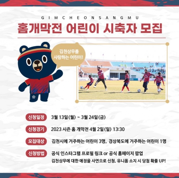 김천상무프로축구단이 13일부터 24일까지 홈 개막전 시축에 참여할 어린이 팬을 모집한다. 모집 인원은 4명이다. 김천시에 거주하는 어린이 팬 3명, 김천시 제외 경상북도에 소재를 둔 어린이 팬 1명이 모집 대상이다. 김천상무 창단 이래 김천상무를 지속적으로 응원해온 어린이를 대상으로 모집한다.
