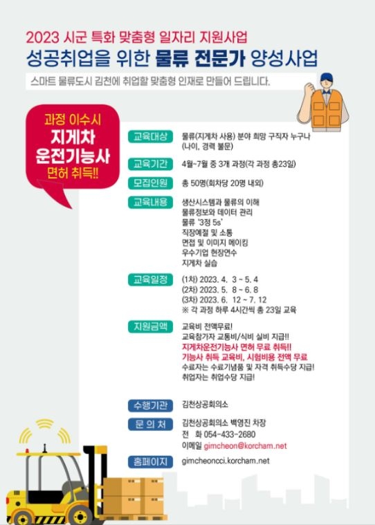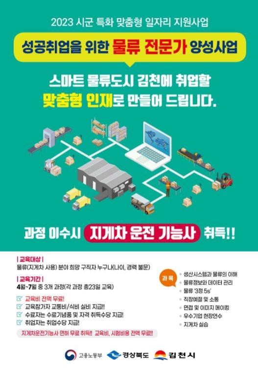 김천상공회의소(회장 안용우)는 지난해에 이어 스마트물류 거점도시로 거듭나고 있는 지역 산업의 특성에 맞는 인재를 양성하여 일자리를 찾아주는 「시군 특화 맞춤형 일자리 지원사업」을 진행한다.