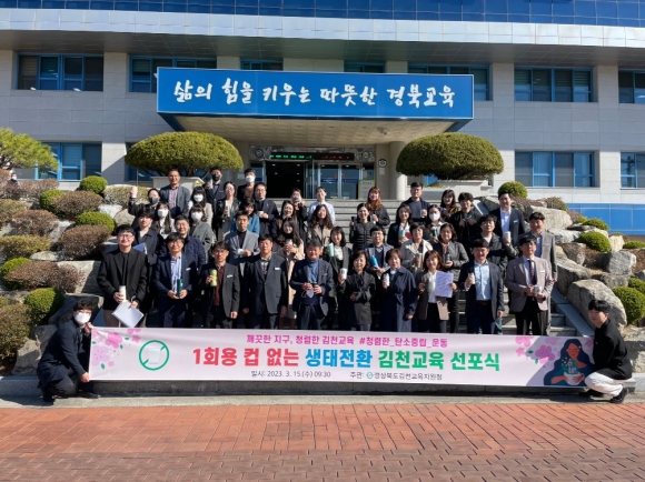 경상북도김천교육지원청(교육장 공현주)은 2023. 3. 15.(수) 김천교육지원청 직원 전원이 참여한 가운데 ‘1회용 컵 없는 생태전환 김천교육 선포식’을 개최하였다.