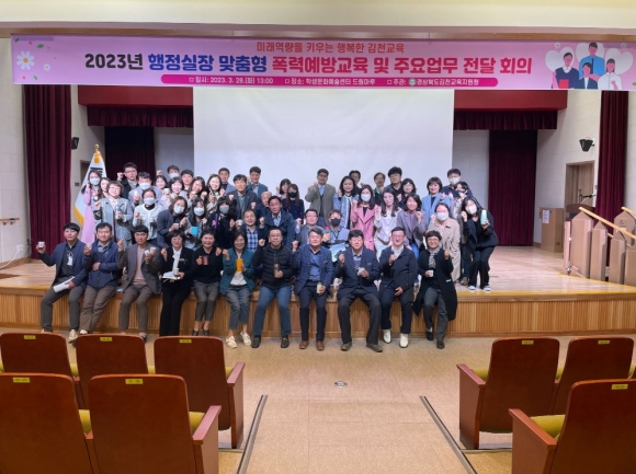 경상북도김천교육지원청(교육장 공현주)은 2023. 3. 28.(화) 김천학생문화예술센터 드림마루에서 김천 관내 공립 단설유치원, 공‧사립 초‧중‧고등학교 행정실장 55명이 참석한 가운데 주요업무 전달회의를 개최하였다.