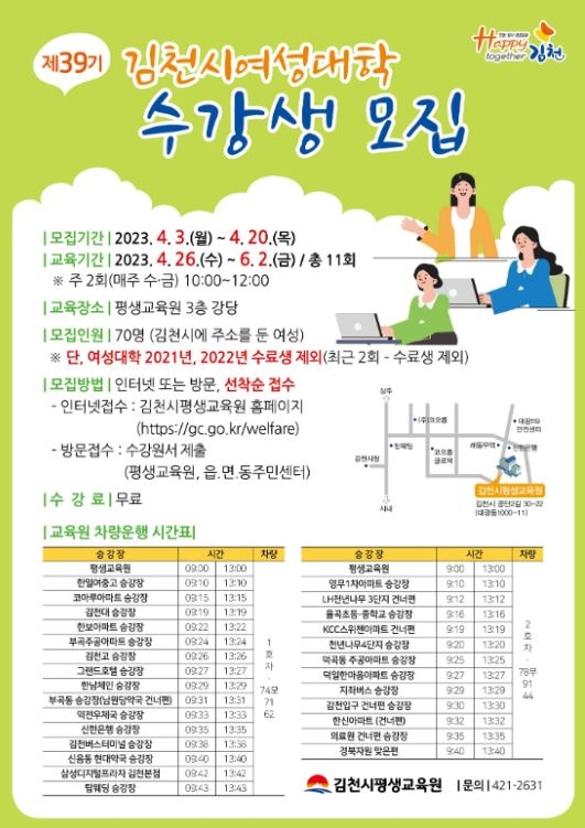 김천시평생교육원에서는 2023년 「제39기 김천시여성대학」 수강생 70명을 4월 3일부터 20일까지 18일간 선착순 모집한다고 밝혔다.