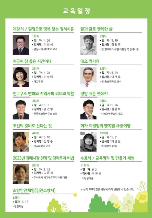 구체적인 강연 일정은 4월 26일 개강식 및 이진석 교수의 힐링으로 행복 찾는 정서 치유 4월 28일 이성미 방송인(개그우먼)의 지금이 참 좋은 시간이다 5월 3일 염건령 소장의 인구구조 변화와 지역사회 리더의 역할 5월 10일 신병주 교수의 조선의 왕비로 산다는 것 5월 12일 고준석 대표의 2023년 경매시장 전망 및 경매 투자 비법 5월 17일 현장체험 5월 19일 강원국 교수의 말과 글로 행복한 삶 5월 24일 이계호 박사의 태초 먹거리 5월 26일 김종혁 대표의 정말 쉬운 챗GPT 5월 31일 이영철 화가의 화가 이영철의 행복별 사랑여행 6월 2일 수료식 및 만들기 체험 순으로 진행된다. |