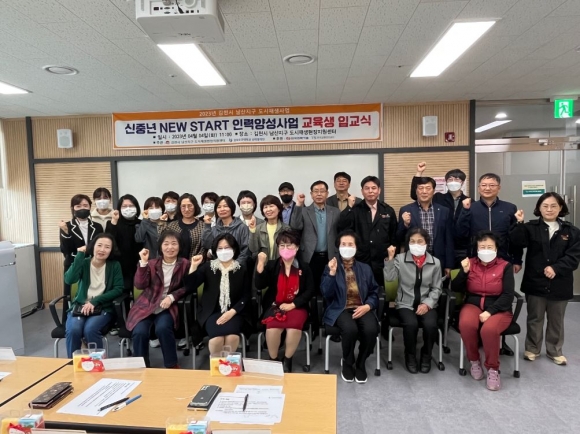 남산지구 도시재생현장지원센터와 경북보건대학교(총장 이은직) 산학협력단은 김천시가 주관하고 한국전력기술(주)과 한국교통안전공단이 후원하는 ‘2023년 남산지구 도시재생 신중년 NEW START 인력양성사업’ 입교식을 4일(화) 11:00, 김천시 남산지구 도시재생현장지원센터에서 개최하였다.
