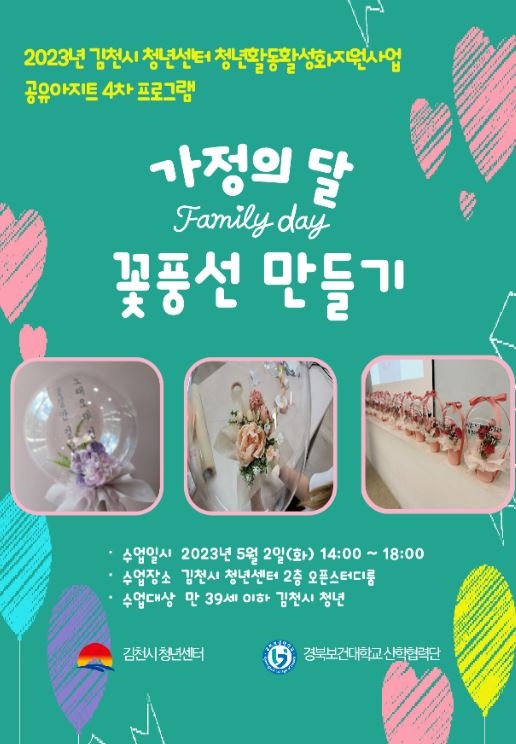 5월 2일(화)에는 공유아지트 4차 “가정의달 꽃풍선 만들기” 프로그램이, 6월 22일(목)에는 공유아지트 3차 사무역량강화클래스 엑셀편 퇴근이 빨라지는 실무엑셀 비기너클래스 나도 할 수 있다, 엑셀!에 이어 공유아지트 5차 사무역량강화클래스 엑셀편 퇴근이 빨라지는 실무엑셀 중급자클래스 “일잘러라면 알고 있는 퇴근이 빨라지는 실무엑셀”이 예정되어 있으며, 김천시 청년센터 홈페이지에서 프로그램 신청·접수할 수 있다. 자세한 사항은 김천시 청년센터 홈페이지 및 인스타그램을 통해 확인 할 수 있다.