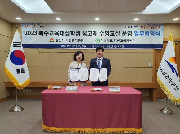 이날 협약식은 김재광 이사장과 교육지원청의 공현주 교육장 포함 관계자 10여 명이 참석한 가운데 김천실내수영장에서 진행되었으며, 「2023년 김천실내수영장 특수교육지원학생 꿈고래수영교실」의 원활한 운영을 위해 기관 간 상호 협의를 목적으로 개최되었다.