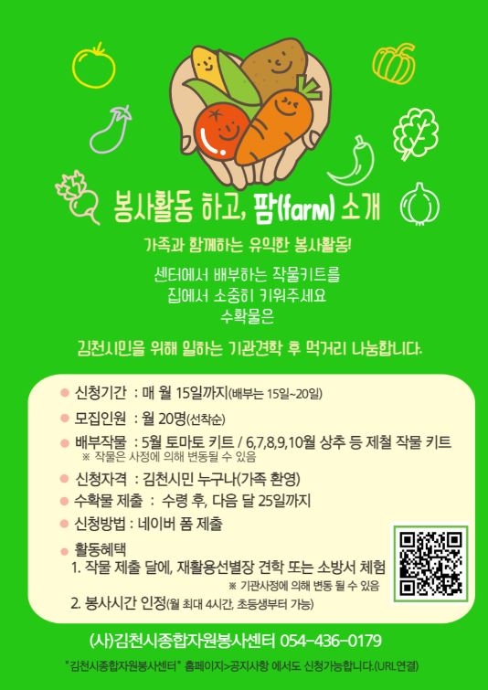 김천시종합자원봉사센터(센터장 김경희)에서는 가정 내 자원봉사 활성화를 목적으로 집에서 작물재배 후, 시민(공동체)을 위해 일하는 이웃과 수확물 먹거리 나눔을 실천하는『봉사활동 하고, 팜(farm)』사업을 시행하였다.