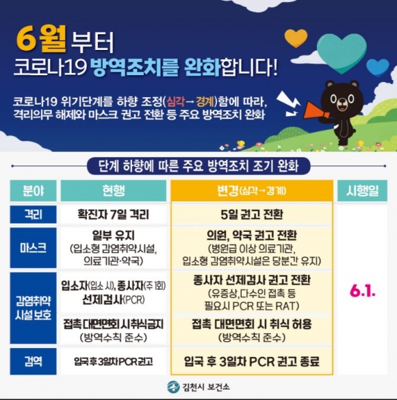 김천시는 중앙대책본부가 6월 1일을 기점으로 코로나19 위기 경보 수준을 ‘심각→경계’로 하향 조정하기로 한 결정에 따라 완화되는 주요 방역 조치 사항을 안내했다.