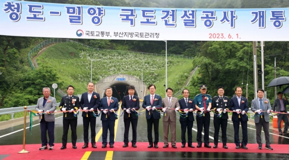 경남 밀양시는 1일 경북 청도군 청도읍 신도터널 입구에서 부산지방국토관리청(청장 진현환) 주관으로 청도-밀양1·2 국도 건설공사에 따른 개통식을 개최하고, 오는 9일 도로 전 구간을 개통한다고 밝혔다.
