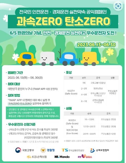 한국교통안전공단은 국토교통부와 경찰청, 손해보험협회 및 모빌리티·민간기업*과 함께 “6월 13일부터 3주간 ‘과속ZERO 탄소ZERO‘ 공익캠페인을 시행한다.“고 밝혔다. 공식 후원(협업) : 티맵 모빌리티, HL만도, KB손해보험, (사)희망VORA