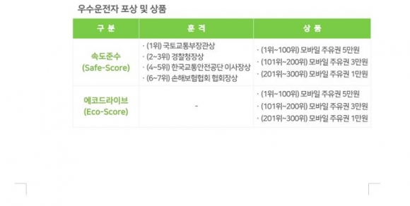 국토교통부, 경찰청 등 기관장 상을 수여(최상위 운전자 7명)하고, 우수운전자 600여명에게 1,800만원 규모의 모바일 주유 상품권도 지급할 예정이다