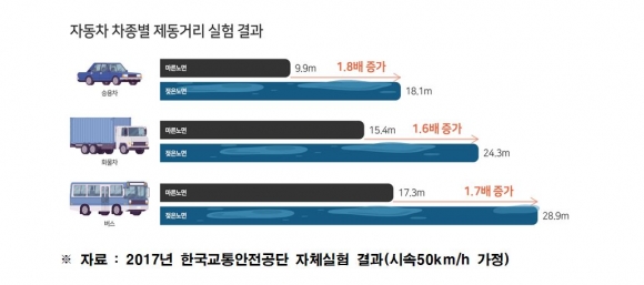 통상 승용차의 경우 빗길에서 평균 제동거리는 맑은 날에 비해 최대 1.8배 증가하는 것으로 나타났다