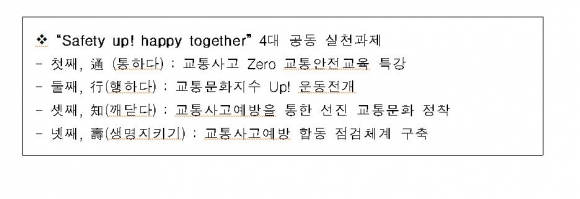 이번 협약은 “교통사고 Zero, 선진교통문화 정착”이라는 공동의 목표를 달성하고 교통관련 유관기관 협력을 강화하기 위해 체결되었으며, 4대 공동 실천과제를 수립하여 이행한다.