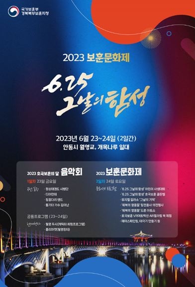 경북북부보훈지청은 오는 24일(토) 월영교 개목나루 일원에서 2023년 보훈문화제「6·25 그날의 함성」 행사를 개최한다.